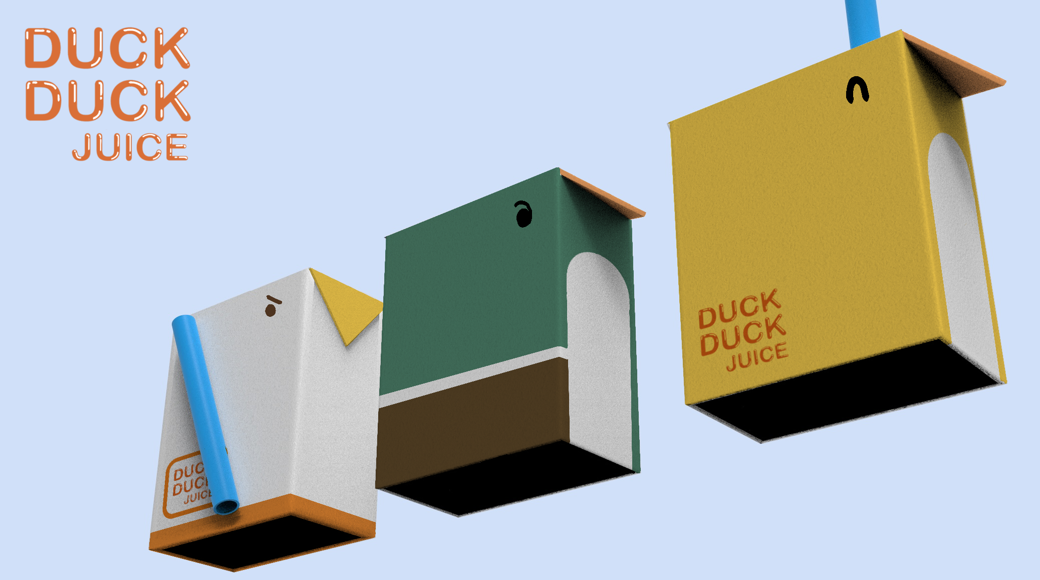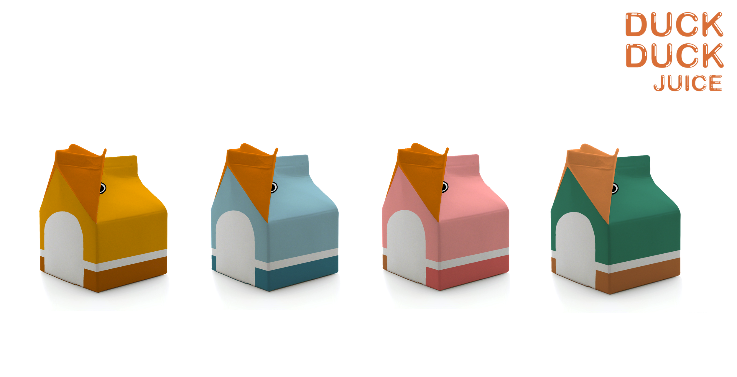 Juice boxes are modeled after common ducks such as the mallard duck, domestic duck, and a common baby duck / rubber duck.